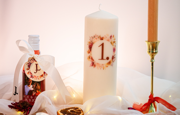 Svatební svíčky jsou krásným dárkem pro hosty i decentní dekorací svatební tabule. Díky personalizovanému potisku se z nich stává originální památka na váš den. Možností je i praktický tisk čísla stolu, jmenovky nebo iniciálů novomanželů přímo na svíčku.